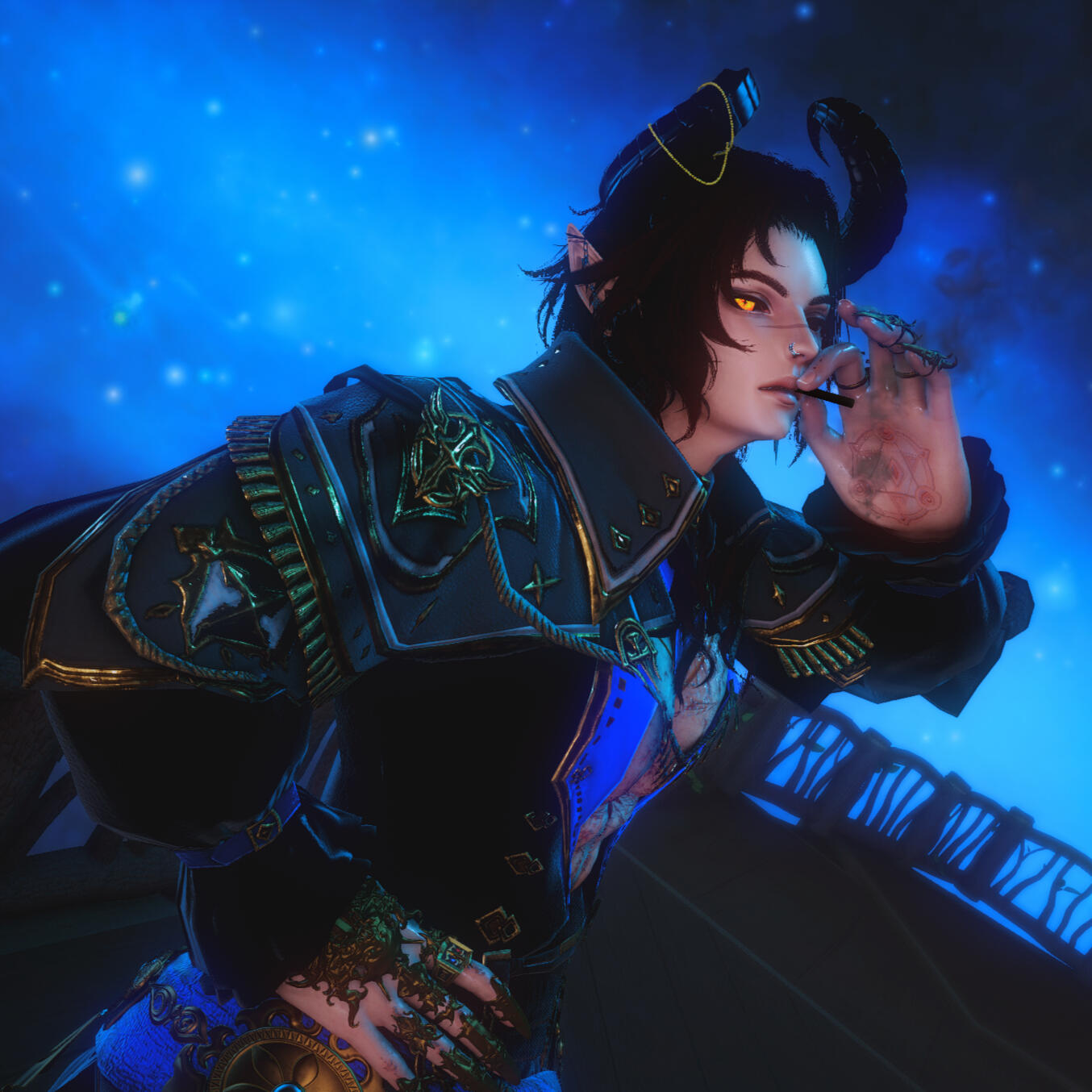 | Quirks: absentmindedly conjures small ink-like creatures when lost in thought. These ephemeral beings, birds, fish, or even tiny dragons; hover around him before fading into wisps of darkness. The more emotional he is, the more unstable and erratic they become- compulsion to steal small objects- Ink-Stained Hands- When alone, Nyx hums ancient, haunting melodies with no known origin- His tail often betrays his emotions. A slow, lazy flick means boredom, a sharp lash indicates irritation, and a curled tip signals deep contemplation or sadness- Sometimes he murmurs to the creatures he brings to life- Rarely Sleeps- Silent Cooking Rituals- Rarely Sleeps- Often smokes from a Kiseru. |
